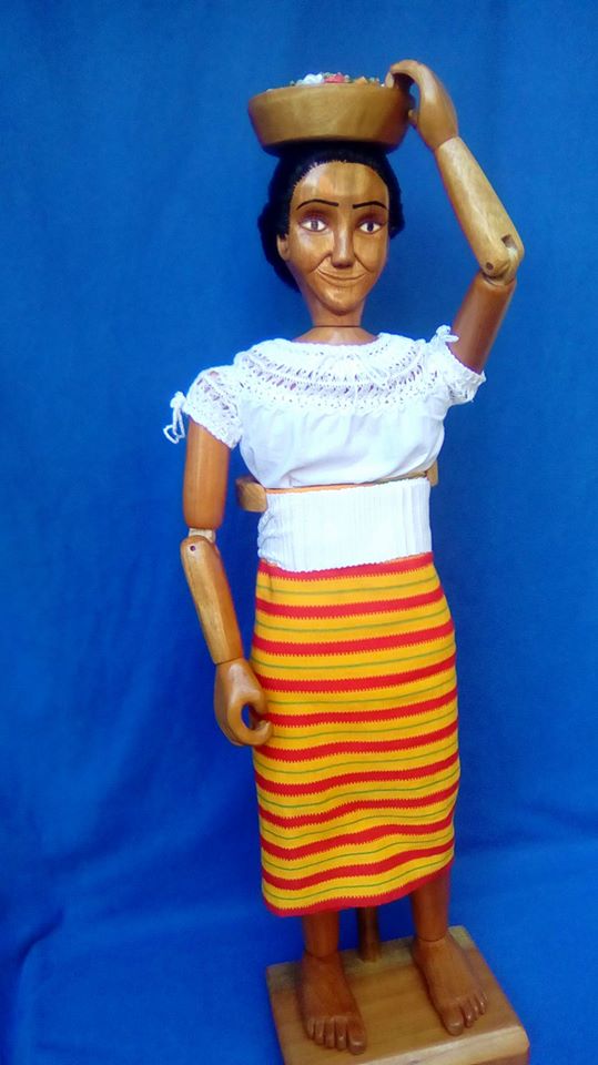 Muñeca articula hecha en madera de cedro, cuenta con 14 piezas. Con vestimenta tradicional de cosoleacaque