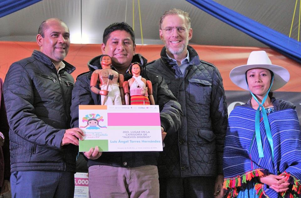 Segundo lugar en el Sexto Concurso Nacional de Muñecas Artesanales, categoría "Nuevos diseños", cuya ceremonia de premiación se efectuó el pasado 16 de noviembre, en Amealco de Bonfil, Querétaro. La pieza comprende un muñeco articulado de 53 cm y una muñeca de 45 cm, mismos que representan a una pareja del municipio de Cosoleacaque de principios del siglo XX, tallada en madera de cedro, con la vestimenta tradicional hecha en manta y telar de cintura (refajo y faja) y portando algunos utensilios (tecomates, hacha y cubeta).